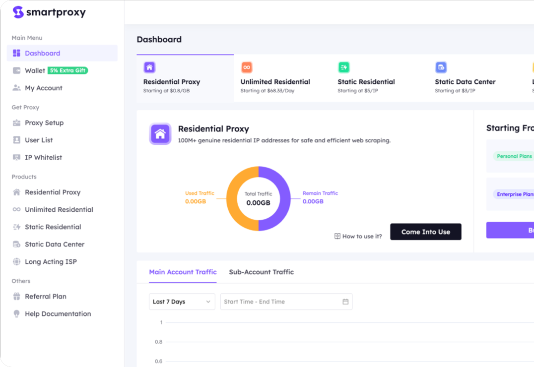 SmartProxy offre proxy residenziali e datacenter affidabili, ottimizzati per AI, automazione e settori data-driven. Stabilità da azienda, analisi in tempo reale e una dashboard intuitiva: ti aiutiamo a scalare più in fretta e con più intelligenza.